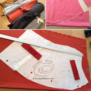 In response to the lack of drape in the back of the skirt (and by comparison to the original sketch) I slashed the pattern open and added another 30cm of drape (brown paper sections). The turquoise sample has now got a total of 50cm drape in the lower section of the CB seam. And that’s a lot of fabric as you can see from the photos below.