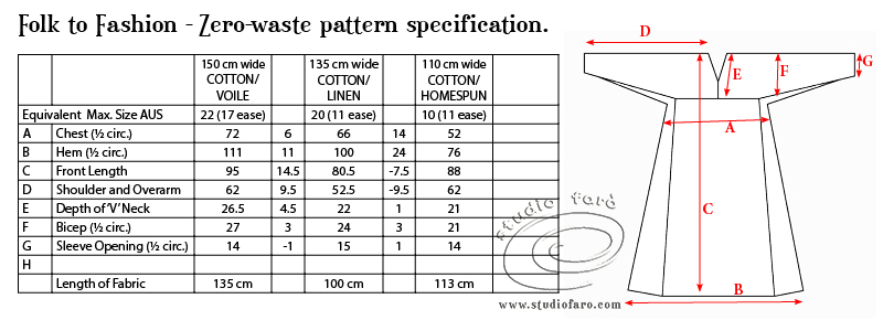 Because the original idea for this folk design is based on a proportional breakdown of available cloth, there are a number of variables between garments made with different widths in fabric. In the table below I’ve made a detailed garment specification for the Folk to Fashion Tunic, made in three different width fabrics. I’ve also added an approximate Australian Size as a guide for you to decide which width fabric you should be using to make your own tunic. The variation in the sleeve length of the Cotton/Linen sample is a result of only having just over 1 m of fabric.