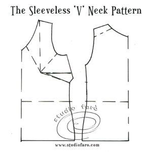 The pattern plan below is an example of a sleeveless style with a ‘V’ neck. Gape darts are needed in this style in the neckline (1cm/3/8″) and the armhole (1cm/3/8″) to achieve a clean, close fit. Width reduction in the underarm (-1cm /3/8″), along the side seam will remove the extra fabric required when including a sleeve. These three reductions in the armhole, neckline and side seam can be applied to nearly all similar styles. The measurements suggested in this paragraph are approximate only but represent a good start in developing these style.