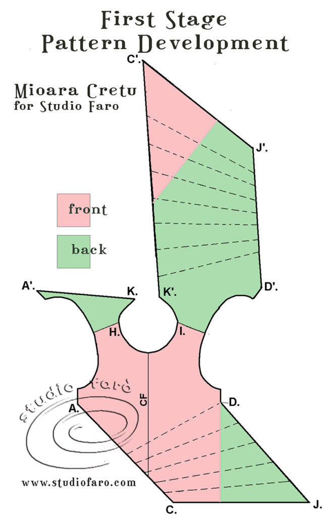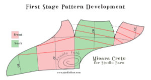 As soon as I tried the pattern making on the top myself I realised what was going on. I’ve included colour coding in the diagrams below to keep track of the front and back of the garments as you work your way through the pattern.
