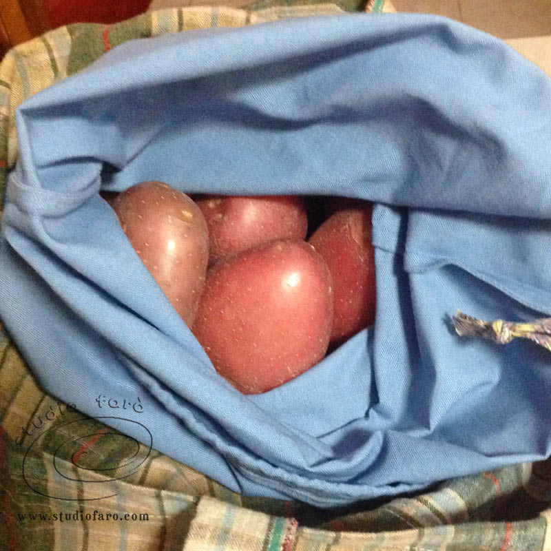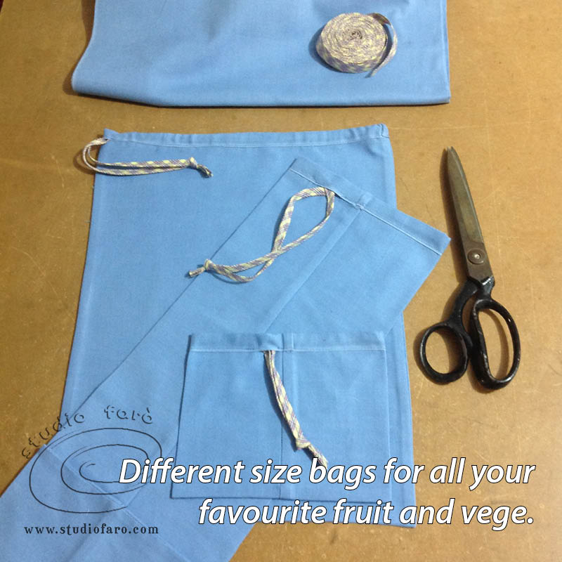 Well I’ve finally done it and I’d like to share that process with everyone else. I’ve re-used old tea towels, bed sheets and fabric scraps to make an amazing range of veggie bag sizes to suit all the fruit and veg I buy every week. I’ve got long narrow bags for the Spring Onions. And I’ve made small bags for the precious ginger and garlic haul.