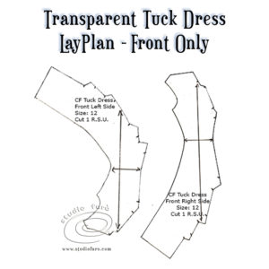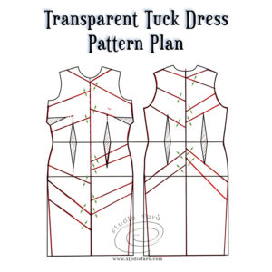 Set out below in the pattern plan is my fitted dress block with the side seams equalised and with the position of the tucks indicated by the red lines. You’ll cut through the red lines, from the centre front and back, toward the side seams and armhole. The green arrows show where the pattern will open up to make the large tucks that are the main design feature in this style. The armhole and side seam will stay connected as we open up the CF and CB of the dress for the right and left sides. In the pattern development that follows I’ve only displayed the front of the dress. Pattern development for the back dress is the same but in many ways far simpler as there is no bust dart.