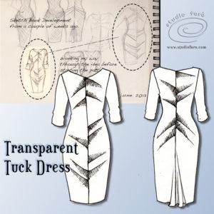 I’ve decided to make the outer shell of the dress in a semi-transparent fabric (black) and the lining of the dress will be either white or a flesh tone. At the point the tucks fold over (centre seams), the three layers of semi-transparent fabric become a solid colour. A fish tail has been added at the back for style for ease of walking. What differs in the production sketch is that I have decided not to put tucks in the sleeves as there is enough going on in the body of this dress already.